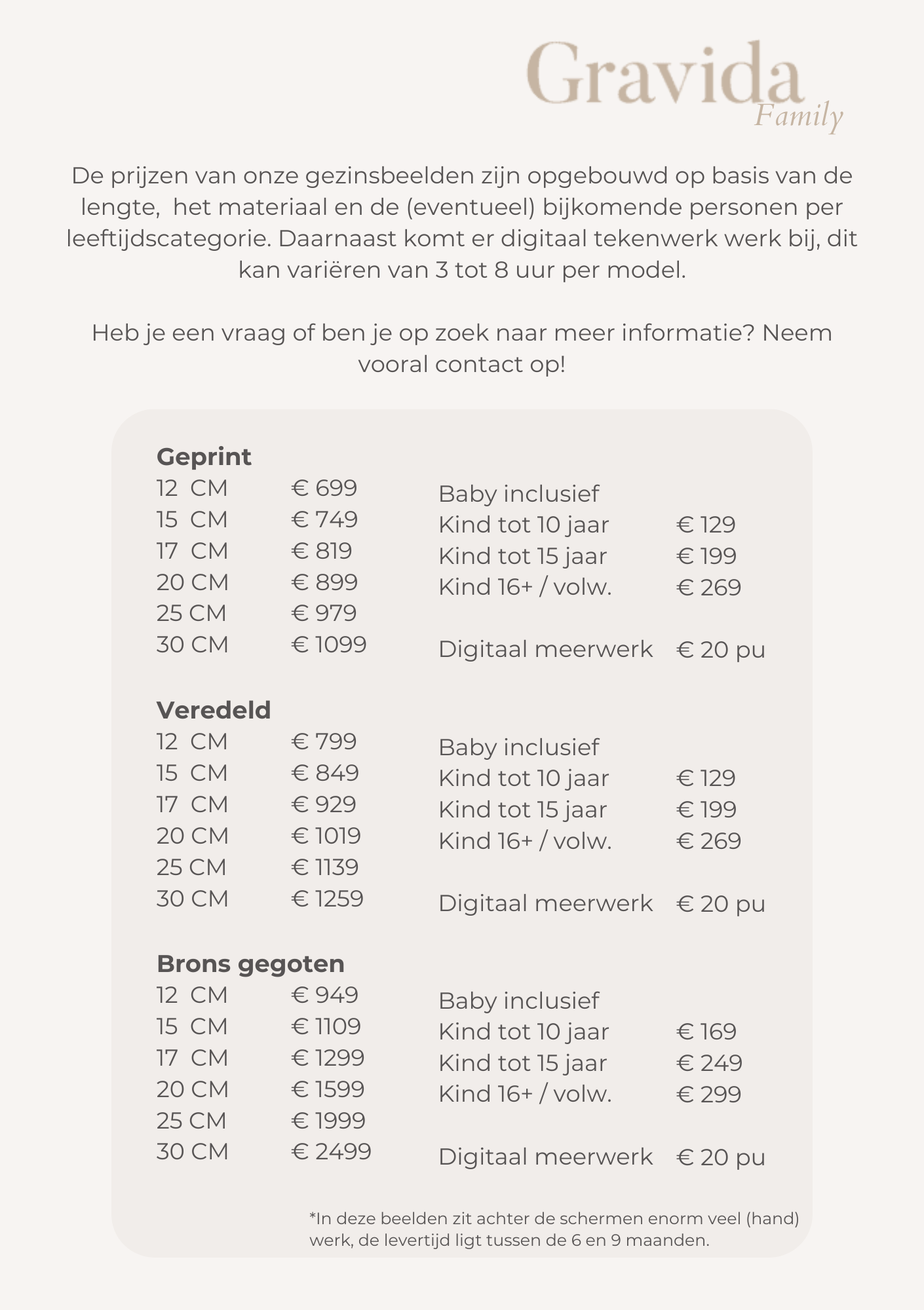 Wat leuk dat je interesse hebt in een beeld van of met jouw gezin, we kunnen ons goed voorstellen dat je bepaalde periodes voor altijd wilt vastleggen!